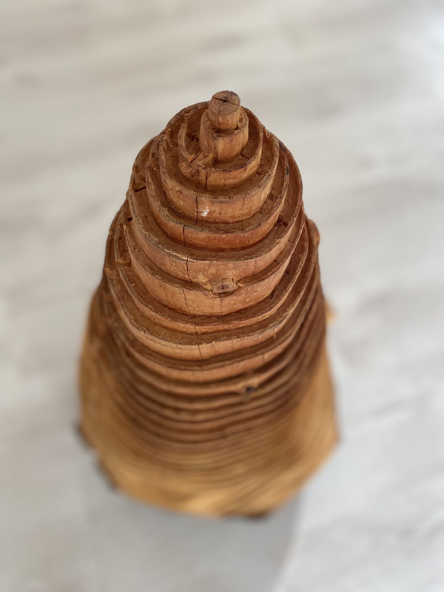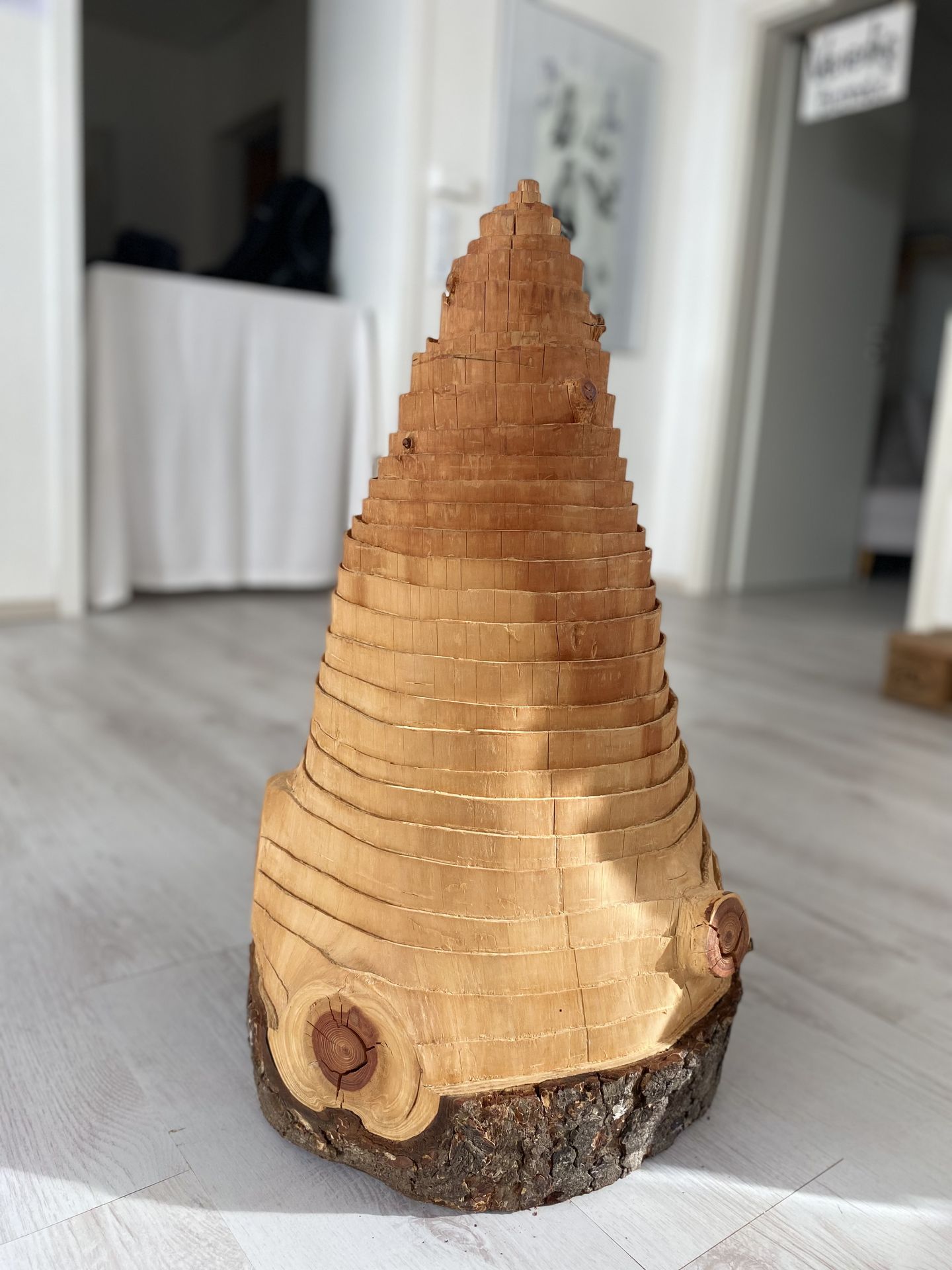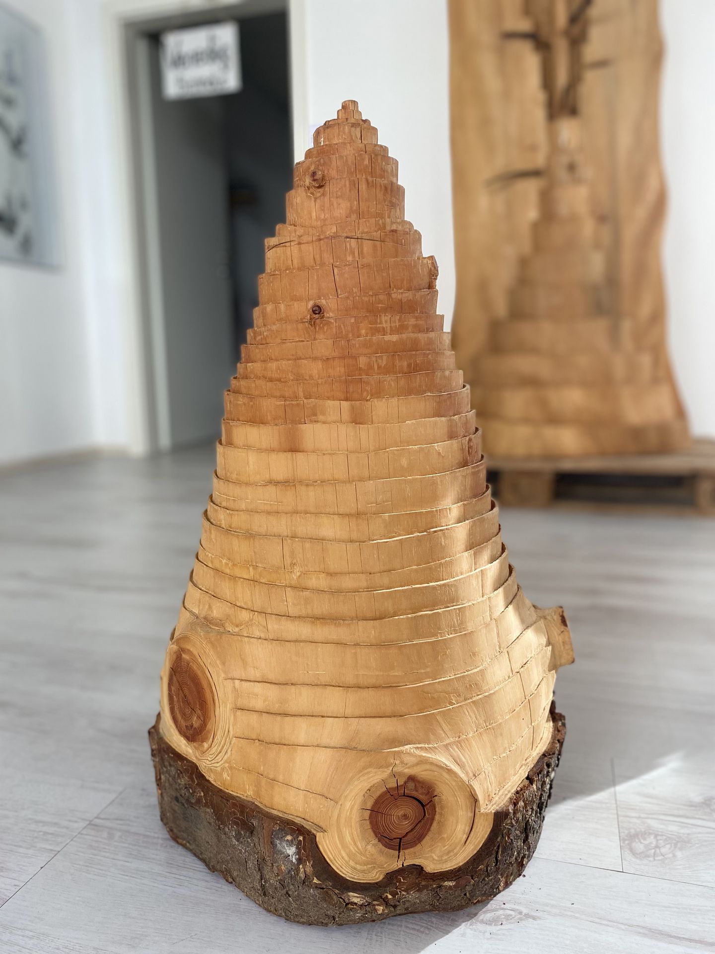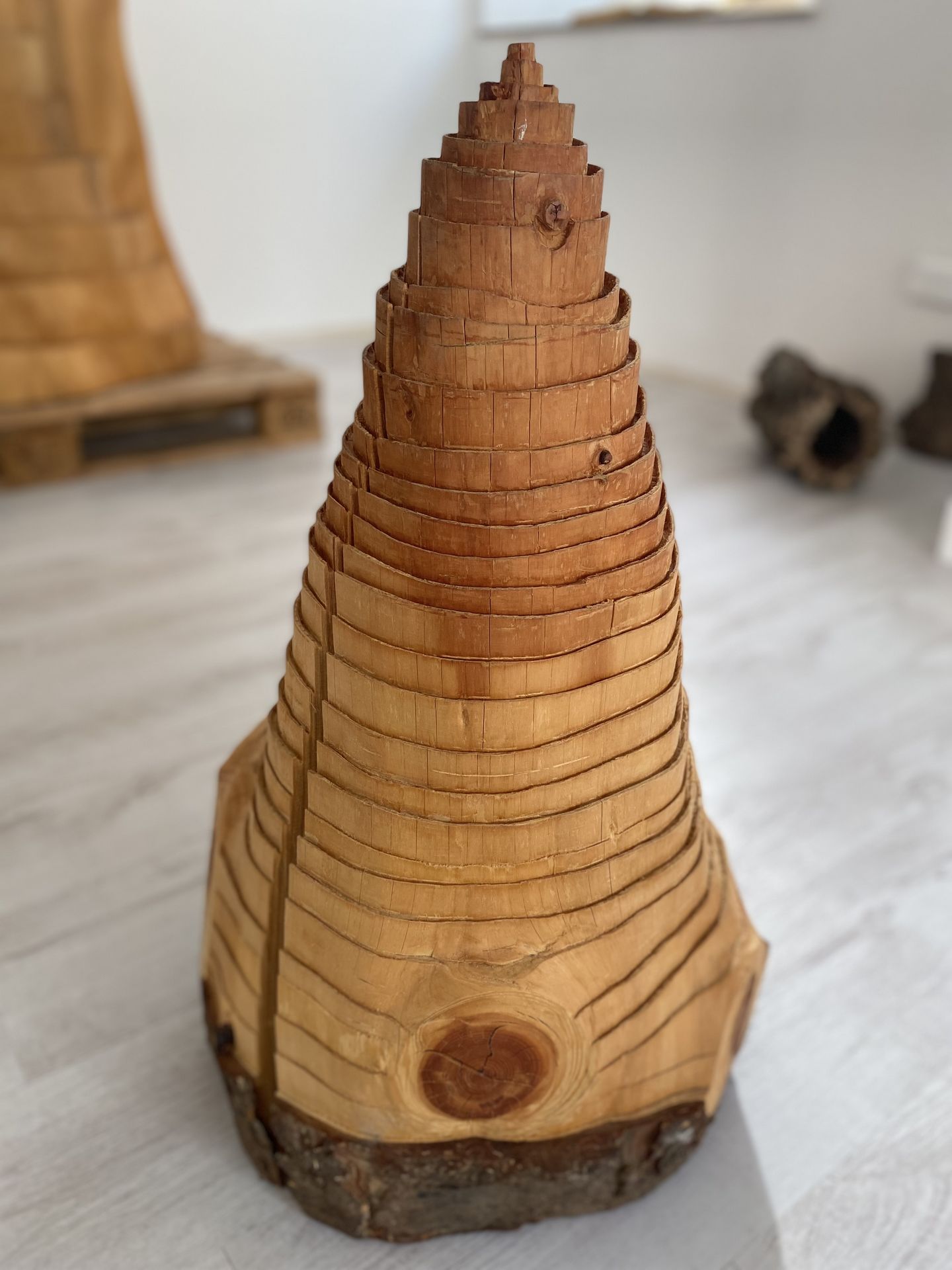 Die Linien im Holz sind die Jahrringe. Jedes Jahr wird ein neuer Ring gebildet. Zählt man diese, lässt sich das Alter der Bäume bestimmen. Doch nicht nur das Alter auch das Wachstum und das Leben von Bäumen lässt sich rekonstruieren. Nachdem sich das Bestreben, der Abgrenzung und Differenzierung einzelner Jahrringe als möglich erwies, entstanden hierzu Folgearbeiten mit ihren kegelförmig abgestuften Formen.